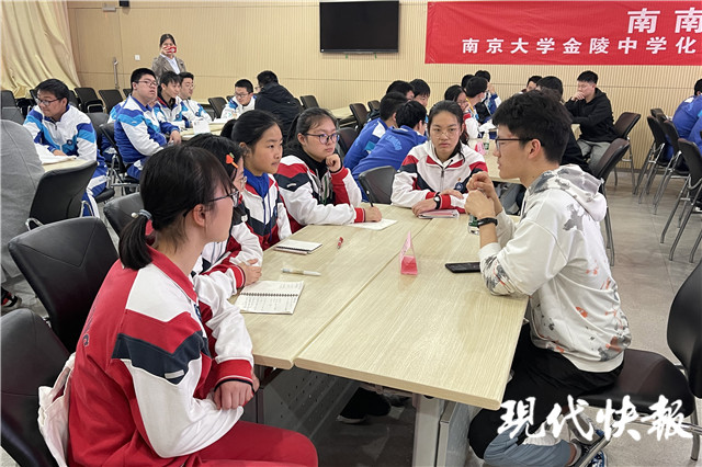 現(xiàn)場(chǎng),包括金中校友戴飛在內(nèi)的南大化學(xué)化工學(xué)院學(xué)生代表,就化學(xué)競(jìng)賽與金中化競(jìng)班學(xué)生交流討論。