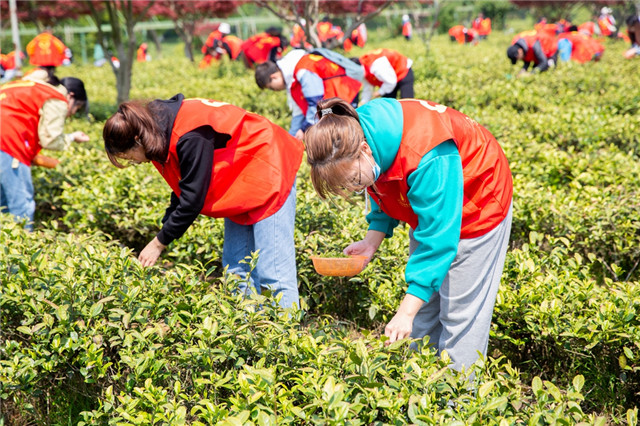 “微黨課”結(jié)束后,500多名師生們身著紅馬甲,走進茶園,在技術(shù)人員的指導(dǎo)下進行采茶,接受勞動教育,感受茶農(nóng)們的艱辛,體驗今天幸福生活的來之不易。