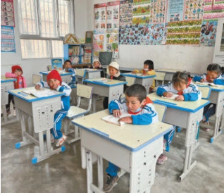 2017年,隨著易地扶貧搬遷政策的落實(shí),越來(lái)越多村民選擇搬到山腳開(kāi)始新的生活。學(xué)校里的孩子們由32名減少到9名。“9個(gè)孩子有7個(gè)是留守兒童,最大的8歲,最小的3歲。”完么仁增把黑板分成兩塊,左邊是一年級(jí),右邊是學(xué)前班,“安排了語(yǔ)文、數(shù)學(xué)、美術(shù)、道德與法治4門(mén)課,采用復(fù)式班的教學(xué)模式”。