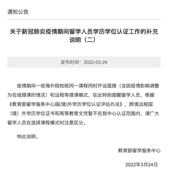 在2021年3月19日,教育部留學(xué)服務(wù)中心發(fā)布了《關(guān)于新冠肺炎疫情期間留學(xué)人員學(xué)歷學(xué)位認(rèn)證工作的補(bǔ)充說明》,其中提到“因受疫情影響,被迫選擇通過在線方式修讀部分或者全部課程的留學(xué)人員,在滿足海外高校規(guī)定的學(xué)位授予條件后,其所獲得的學(xué)位可以獲得正常認(rèn)證”。