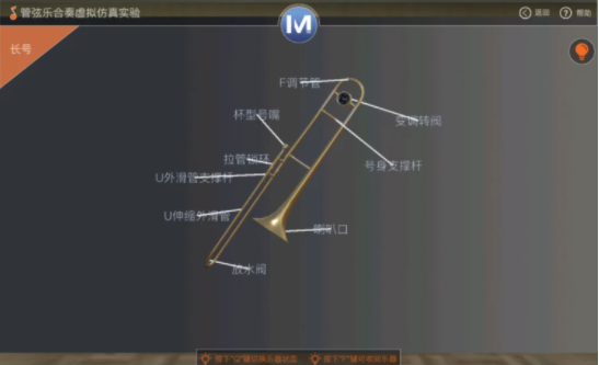 模塊一為管弦樂器分組與構造。學生在虛擬場景中通過鼠標進行三維全視角旋轉觀察,完成弦樂器、銅管樂器、木管樂器和打擊樂器四個不同組別32件樂器的構造與部件知識學習。