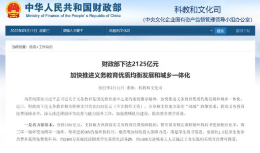 財政部:下達2125億元加速義務(wù)教育優(yōu)質(zhì)均衡發(fā)展