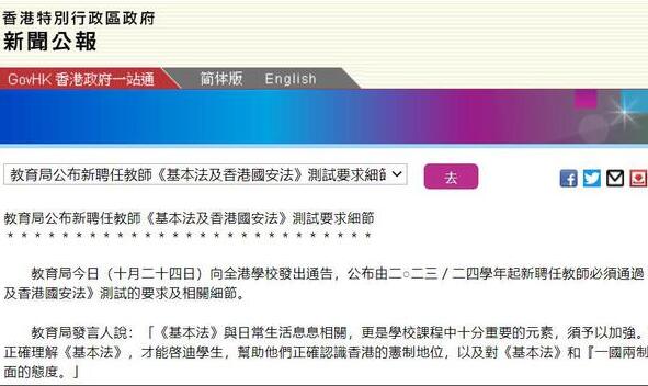 據(jù)香港特別行政區(qū)政府網(wǎng)站消息,10月24日,香港特區(qū)政府教育局向全港學(xué)校發(fā)出通告,提出2023-2024學(xué)年起新任教師聘用必須通過《基本法》及《香港國安法》測試。有關(guān)要求適用于教師職系的所有職級,包括校長。