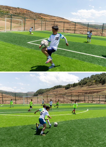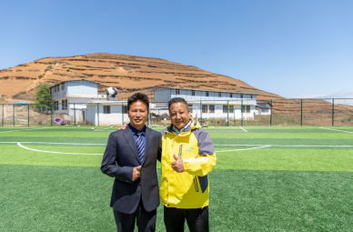 視角來到室外,由中國女足援建的標(biāo)準(zhǔn)化足球場(chǎng),綠意盎然,宛如云端上的一顆綠寶石。球場(chǎng)上,支教老師崔老師正帶著象寶足球隊(duì)火熱訓(xùn)練中,運(yùn)營團(tuán)隊(duì)和愛心人士有幸在一旁全程觀摩。