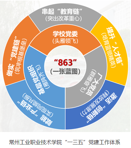 常州工業(yè)職業(yè)技術(shù)學(xué)院黨委不斷豐富“一三五”黨建工作體系內(nèi)涵,相繼推出《常州工業(yè)職業(yè)技術(shù)學(xué)院關(guān)于進(jìn)一步推進(jìn)新時代黨建示范創(chuàng)建和質(zhì)量創(chuàng)優(yōu)工作的實施意見》《常州工業(yè)職業(yè)技術(shù)學(xué)院關(guān)于實施“一三五”黨建工作體系的方案》《常州工業(yè)職業(yè)技術(shù)學(xué)院先鋒人物評選辦法》《“新能紅盟”行動——打造常州工業(yè)職業(yè)技術(shù)學(xué)院基層黨組織新能源黨建品牌建設(shè)項目實施方案》等黨建創(chuàng)新創(chuàng)優(yōu)舉措,將“加強黨的建設(shè)”融入高水平高職學(xué)校建設(shè)方案,以政治建設(shè)統(tǒng)領(lǐng)黨對學(xué)校工作的全面領(lǐng)導(dǎo),持續(xù)開展以“八大工程”“六大重點項目”“三十個核心指標(biāo)”為抓手的重點計劃,立足“學(xué)校黨委—基層黨組織—全體黨員”三級框架,精準(zhǔn)實施“頭雁領(lǐng)飛”“雁陣齊飛”“群雁奮飛”的三“飛”工程,開展“先鋒人物”評選,強化先鋒引領(lǐng),以“新能紅盟”等譜系化黨建品牌建設(shè)為載體促進(jìn)“五鏈耦合”,用“黨建鏈”串起具有高職教育類型特征的“教育鏈”,從而提升行業(yè)和企業(yè)急需的“人才鏈”、激活地方院校技術(shù)技能積累的“創(chuàng)新鏈”、賦能城市發(fā)展的“產(chǎn)業(yè)鏈”,推進(jìn)“城產(chǎn)教科創(chuàng)”融合發(fā)展。