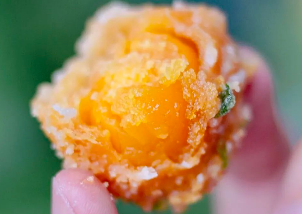 咸蛋黃愛好者的福音。一顆顆剔透光亮的咸蛋黃包裹著輕薄的面衣下鍋,炸至酥脆后拌入熱騰騰的糖漿,最后再佐以蔥花點綴。咸甜油香,口感口味層次都很豐富,一定要趁熱吃。