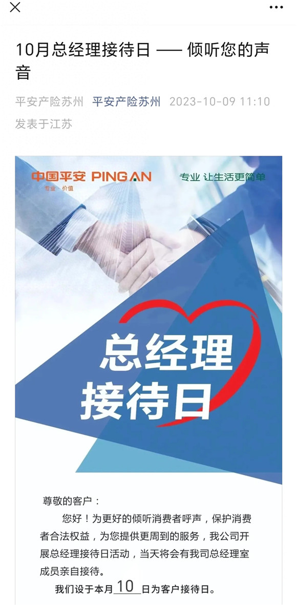 為確保活動取得預(yù)期效果,平安產(chǎn)險蘇州分公司提前五個工作日將接待日信息公示在公司官網(wǎng)、門店等醒目位置,以真正達到對外及時解決消費者訴求、對內(nèi)強化監(jiān)督管理力度的目的。
