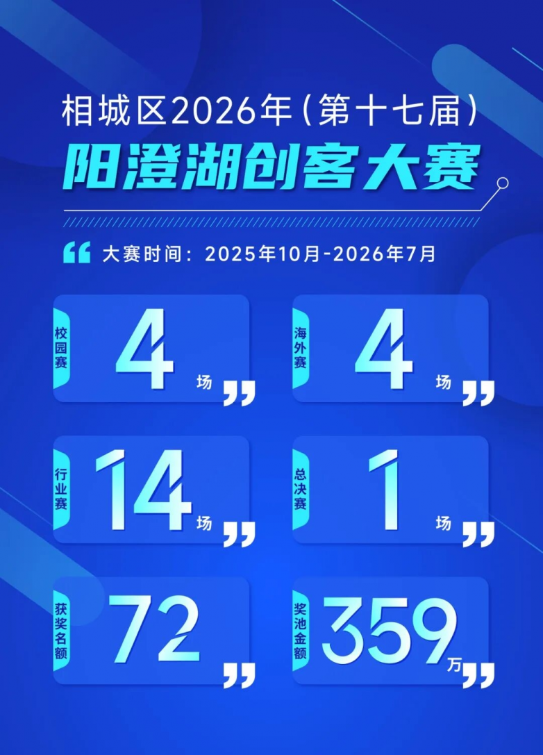 陽澄湖畔創(chuàng)客聚,才涌相城創(chuàng)新地!為助力蘇州市及相城區(qū)重點產(chǎn)業(yè)發(fā)展,打造“以賽引才,才聚相城”的動態(tài)創(chuàng)新鏈,相城區(qū)2026年(第十七屆)陽澄湖創(chuàng)客大賽正式開啟!