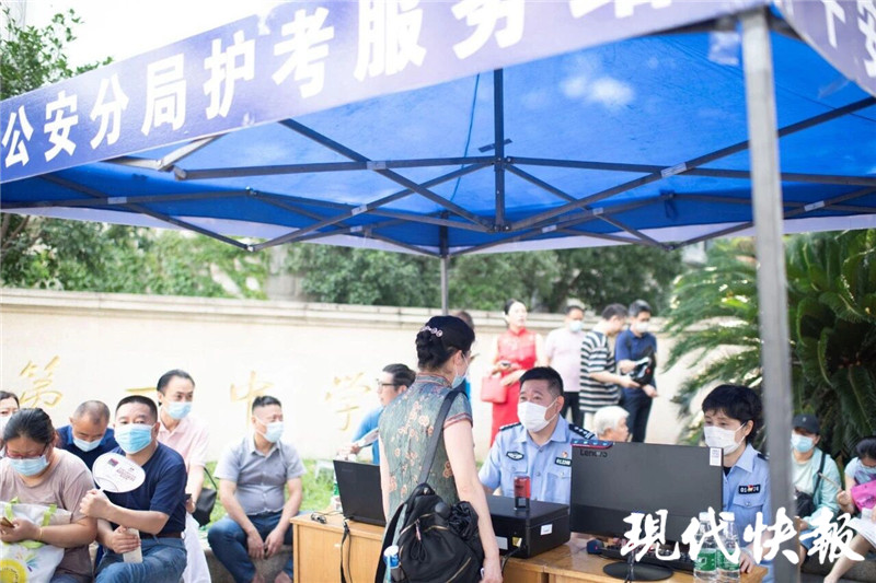 當(dāng)天上午8點,現(xiàn)代快報記者在南京市第一中學(xué)門口看到民警正在對考生及送考家長進行有序引導(dǎo)。為全力做好護考工作,警方在每個考點均配備3名執(zhí)勤警力,同時安排1輛特警武裝巡邏車做好應(yīng)急處突工作。針對往常時有發(fā)生的考生忘帶身份證等突發(fā)事件,警方還在每個考點門前設(shè)置護考服務(wù)點,引入公安戶政辦理一攬子軟硬件系統(tǒng),現(xiàn)場安排行政審批辦證民警為考生服務(wù),僅需1分鐘就可以出具臨時身份證明,最大限度為“馬大哈”考生消除后顧之憂。