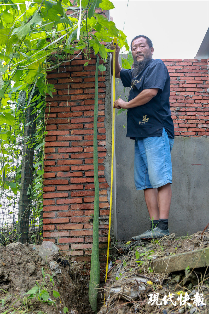 這根絲瓜瓜柄處直徑為2公分,最粗處達(dá)8公分。“種了7年桃子地,桃園里還是頭一次長(zhǎng)出這么長(zhǎng)的絲瓜。”桃園主人陳棟健告訴記者,這根“絲瓜大王”長(zhǎng)速驚人,“前一周還是測(cè)量還是1.95米。今天已經(jīng)長(zhǎng)到2.17米了,真的和現(xiàn)役國(guó)家隊(duì)中鋒周琦一樣高了。”