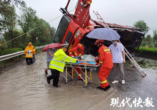 貨車側(cè)翻壓住面包車 3人受傷