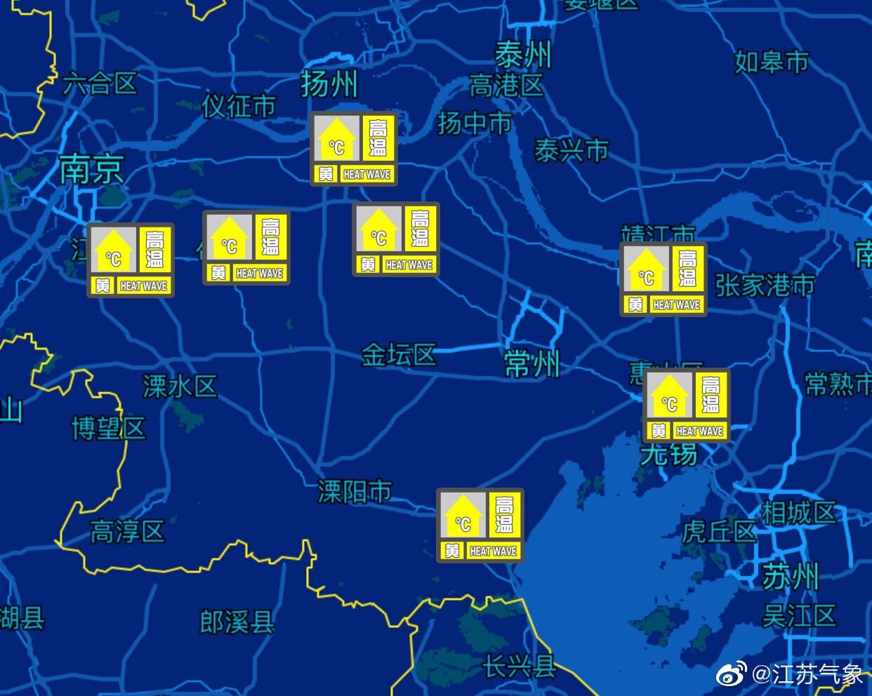 江蘇省氣象臺也于9時22分發(fā)布高溫黃色預(yù)警信號:預(yù)計(jì)南京、蘇州、無錫、常州、鎮(zhèn)江、揚(yáng)州、泰州、南通地區(qū)未來連續(xù)三天最高氣溫將達(dá)35℃到36℃,提醒大家注意防范。