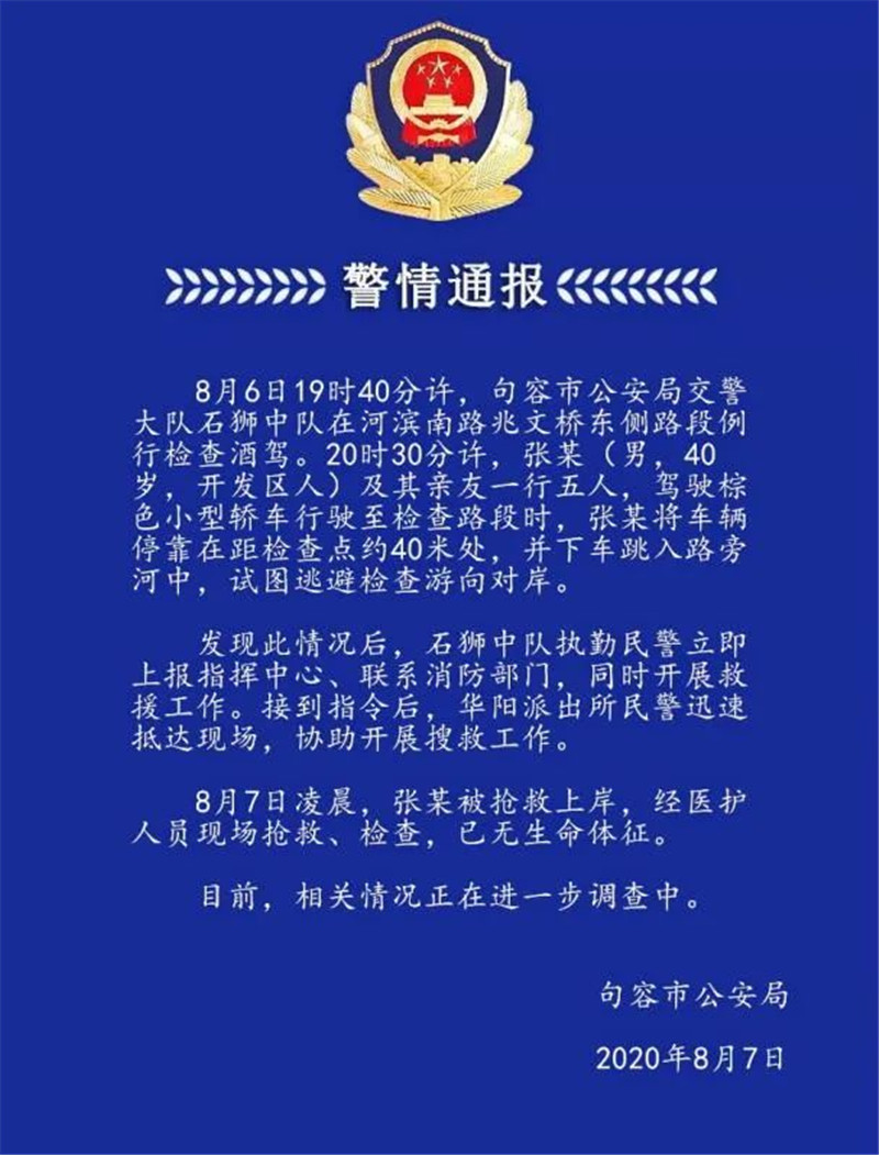 (記者 曹德偉)8月7日下午,句容警方通報(bào)一則警情。8月6日晚,句容交警例行檢查酒駕時(shí),一男子下車跳入路旁河中試圖逃避檢查,不幸溺亡。