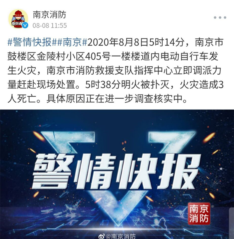 據(jù)了解,8月8日5時(shí)14分,南京市鼓樓區(qū)金陵村小區(qū)405號一樓樓道內(nèi)電動自行車發(fā)生火災(zāi),南京市消防救援支隊(duì)指揮中心立即調(diào)派力量趕赴現(xiàn)場處置。5時(shí)38分明火被撲滅,火災(zāi)造成3人死亡。具體原因正在進(jìn)一步調(diào)查核實(shí)中。