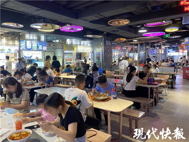 8月11日下午2點,盡管已過飯點,但萊迪廣場地下一層美食城依舊客滿。麻辣香鍋、鴨血粉絲、涼皮涼面、炒飯蓋飯,這里有各地美食供食客選擇。上一桌客人剛剛離開,保潔員胡大姐走到桌旁,快速收拾起餐盤。這一桌客人沒有留下剩飯剩菜,她收拾起來很方便。“來這邊吃飯的人基本只點一兩樣,剩菜不會太多。”