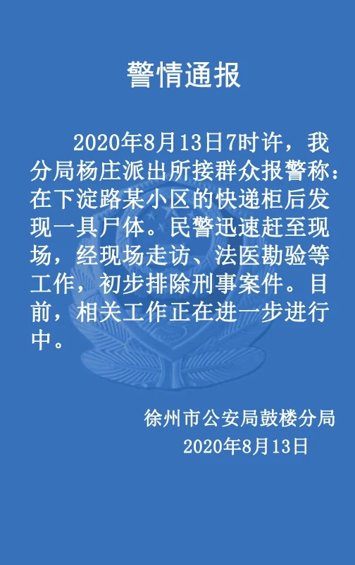 (記者 張曉培)8月13日,徐州市公安局鼓樓分局發(fā)布警情通報稱,當天早上7點多,楊莊派出所接群眾報警,在下淀路某小區(qū)的快遞柜后發(fā)現(xiàn)一具尸體。