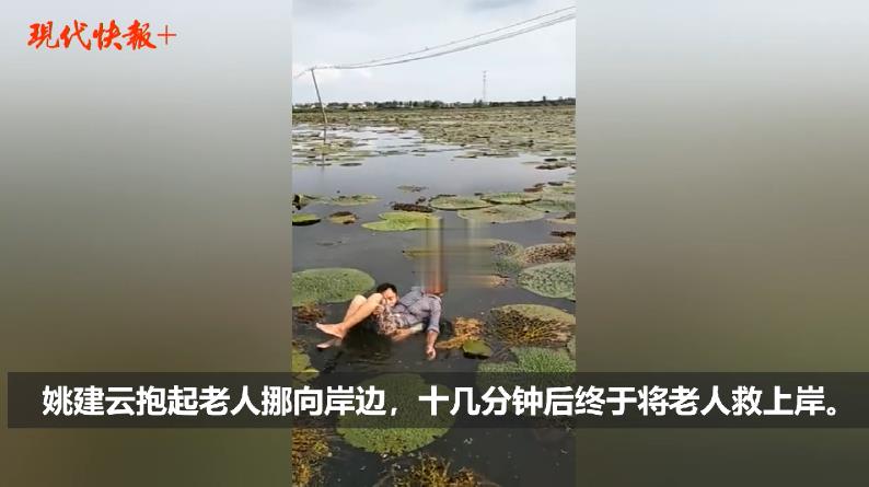 姚建云、顧軍迅速沖到芡實塘邊,果然發(fā)現(xiàn)一名老人落水,“當時情況非常危險,老人只剩頭部在水面以上。”姚建云毫不猶豫跳進水中進行營救。由于連日的強降雨,此時千畝芡實大塘顯得格外泥濘,姚建云不顧自身可能陷入淤泥中的危險,一邊安慰老人,提醒老人千萬不能亂動,一邊慢慢地挪向老人。抓住老人以后,姚建云抱起老人一步一步挪向岸邊,經(jīng)過緊張的十幾分鐘,終于將老人營救上岸。
