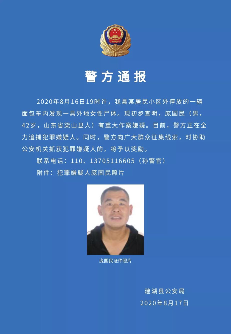 (記者 姜振軍)8月17日下午,鹽城市建湖縣公安局發(fā)布警方通報(bào)稱:2020年8月16日19時(shí)許,我縣某居民小區(qū)外停放的一輛面包車內(nèi),發(fā)現(xiàn)一具外地女性尸體。現(xiàn)初步查明,龐國(guó)民(男,42歲,山東省梁山縣人)有重大作案嫌疑。