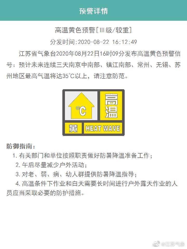 江蘇高溫黃色預(yù)警回歸 未來三天南部持續(xù)35℃+