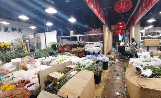 8 月 23 日中午,現代快報記者來到漢中門鮮花批發(fā)市場,在二樓鮮花批發(fā)專區(qū)看到滿地被剪落的鮮花枝葉,還有凌亂的包裝紙盒,幾位清潔人員正在打掃清理。原本就不太寬敞的過道,被兩邊商家擺放的各種鮮花占得更狹窄。