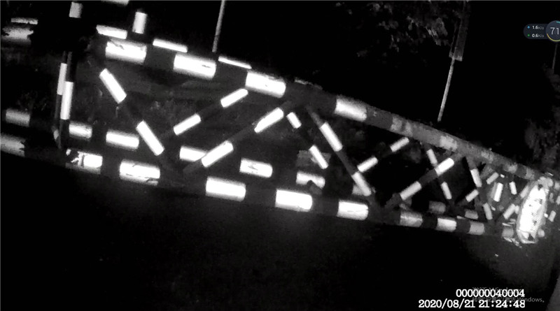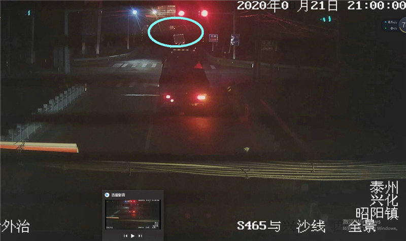 8月21日晚,在周奮加油站前的紅綠燈處,來往車輛正在有序通行。從路邊公共視頻探頭可以看到,在紅綠燈東側(cè)路口,為了限制貨車通行,設(shè)置了一個(gè)限高龍門架。