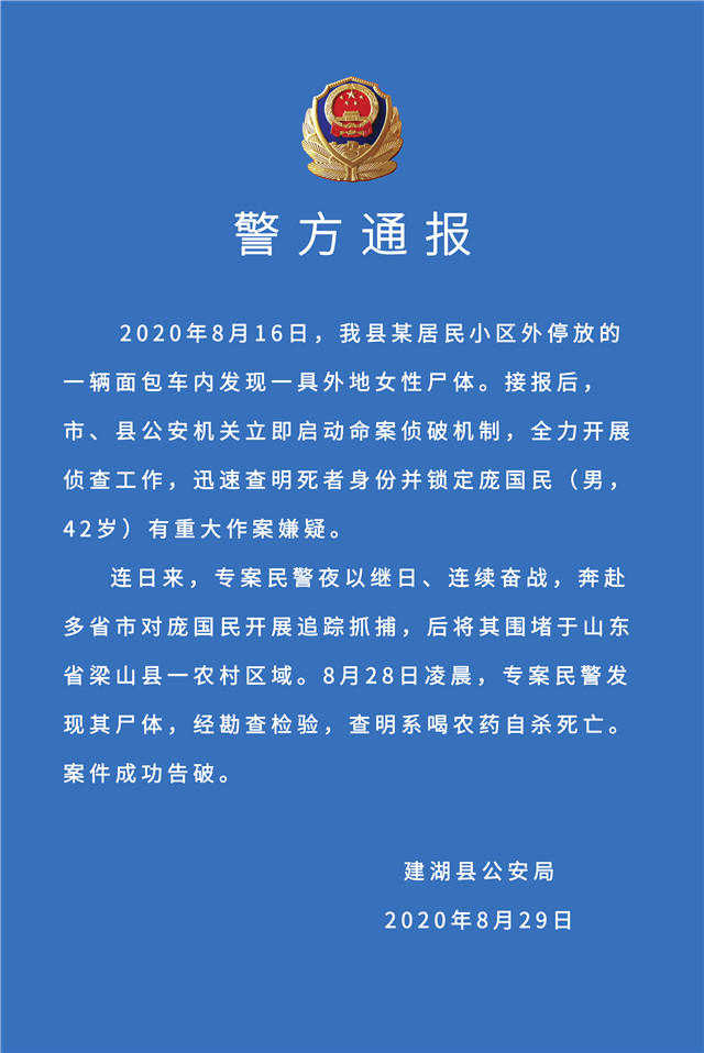 (記者 姜振軍)8月29日傍晚6時(shí)許,鹽城市建湖縣公安局發(fā)布警方通報(bào)稱,2020年8月16日,我縣某居民小區(qū)外停放的一輛面包車內(nèi)發(fā)現(xiàn)一具外地女性尸體。接報(bào)后,市、縣公安機(jī)關(guān)立即啟動(dòng)命案偵破機(jī)制,全力開展偵查工作,迅速查明死者身份并鎖定龐國民(男,42歲)有重大作案嫌疑。