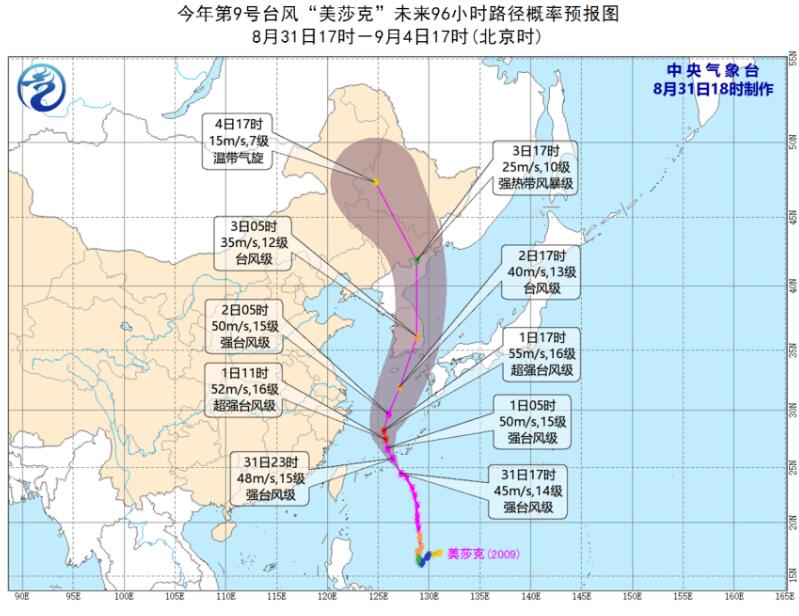 今年第9號(hào)臺(tái)風(fēng)“美莎克”已逐漸成長為強(qiáng)臺(tái)風(fēng)級(jí)別。8月31日17時(shí),其中心位于日本沖繩縣那霸市南偏西方向約200公里的西北太平洋洋面上,中心最大風(fēng)力有14級(jí)(45米/秒)。中央氣象臺(tái)預(yù)計(jì),“美莎克”將以每小時(shí)25公里左右的速度向北偏西方向移動(dòng),強(qiáng)度逐漸加強(qiáng)。9月1日凌晨,“美莎克”將移入東海東南部,強(qiáng)度繼續(xù)增強(qiáng),或?qū)⒊蔀榻衲晔讉€(gè)超強(qiáng)臺(tái)風(fēng)。