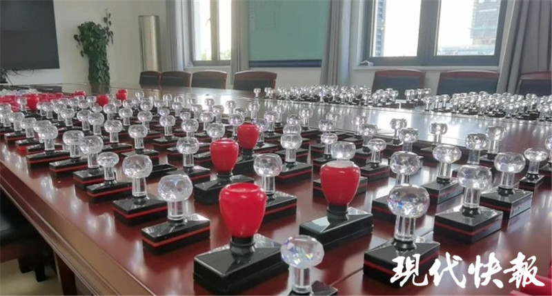 在南京鐵路公安處宿遷站派出所的會(huì)議室,警方展示了這些查獲的印章,它們擺滿長(zhǎng)桌,旁邊還有不少用于刻章的材料,而這些大大小小的物品共計(jì)有一千多件,看上去十分壯觀。