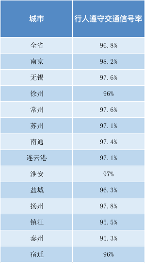全省各地行人遵守交通信號(hào)率平均值為96.8%,南京、無(wú)錫、常州、蘇州、南通、連云港、淮安、揚(yáng)州等地行人遵守交通信號(hào)率均超過(guò)97%。