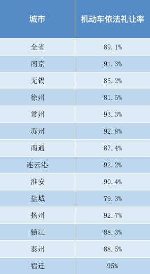全省各地機(jī)動(dòng)車(chē)依法禮讓率平均值為89.1%,南京、常州、蘇州、連云港、淮安、揚(yáng)州、宿遷等地機(jī)動(dòng)車(chē)依法禮讓率均超過(guò)90%。