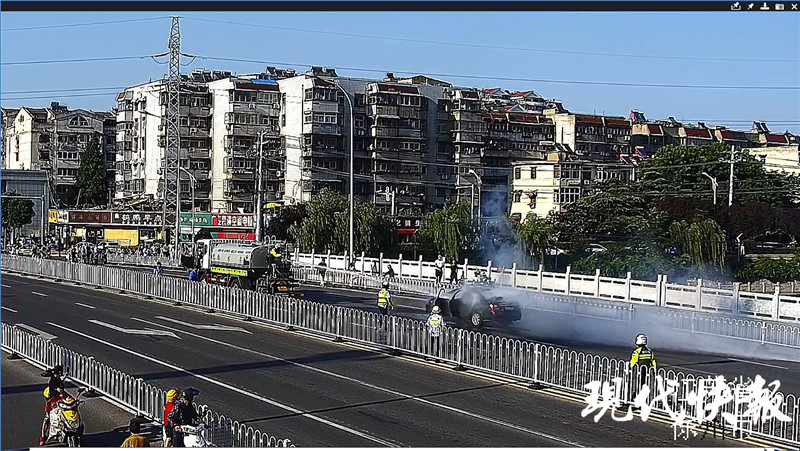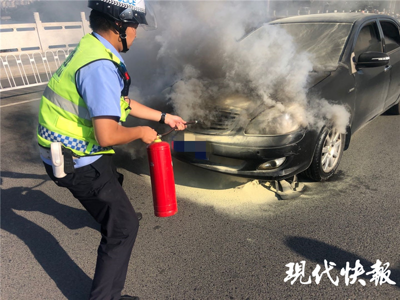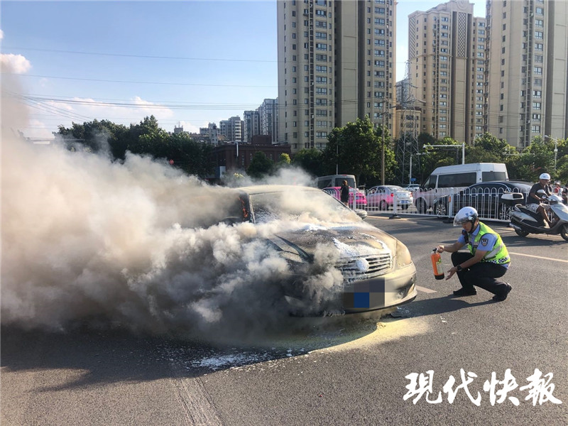 轎車行駛途中自燃 交警滅火時(shí)來(lái)了輛灑水車……