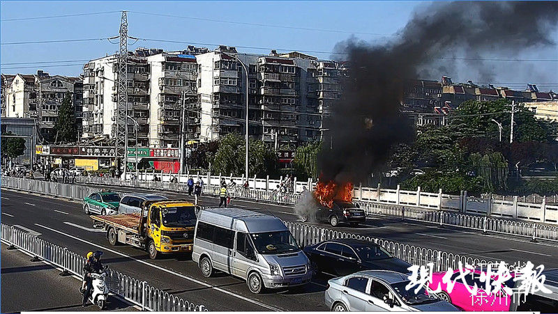 此時(shí),明火已經(jīng)在車頭開(kāi)始燃燒。正在蘇堤北路巡邏的徐州交警泉山大隊(duì)四中隊(duì)輔警杜策發(fā)現(xiàn)了橋上的火情,立即通過(guò)對(duì)講機(jī)請(qǐng)求支援,并向附近的城管崗?fù)ふ?qǐng)求協(xié)助,與銅沛辦事處的城管隊(duì)員們一起拿著滅火器趕到車旁開(kāi)始滅火。