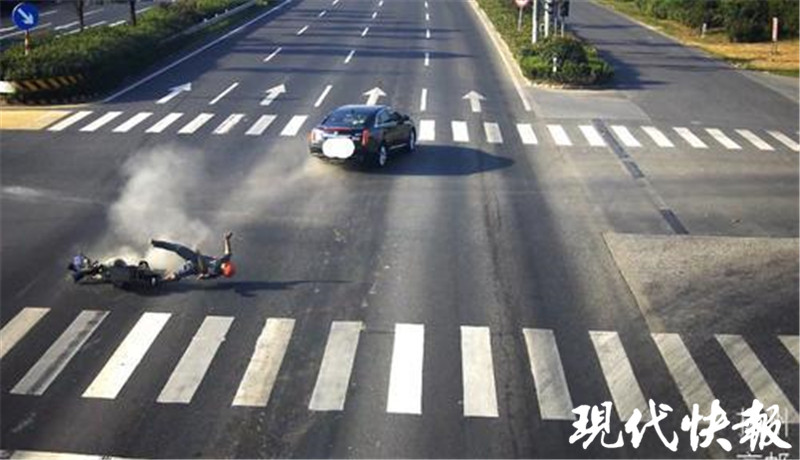當(dāng)日16時26分許,高郵橫涇鎮(zhèn)30歲男子朱某,駕駛轎車行駛到233國道一個路口時,綠燈閃爍僅剩最后一秒。朱某為搶這一秒綠燈,快速穿過路口,沒想到將一名騎電動車的高郵卸甲鎮(zhèn)52歲男子邵某撞飛。