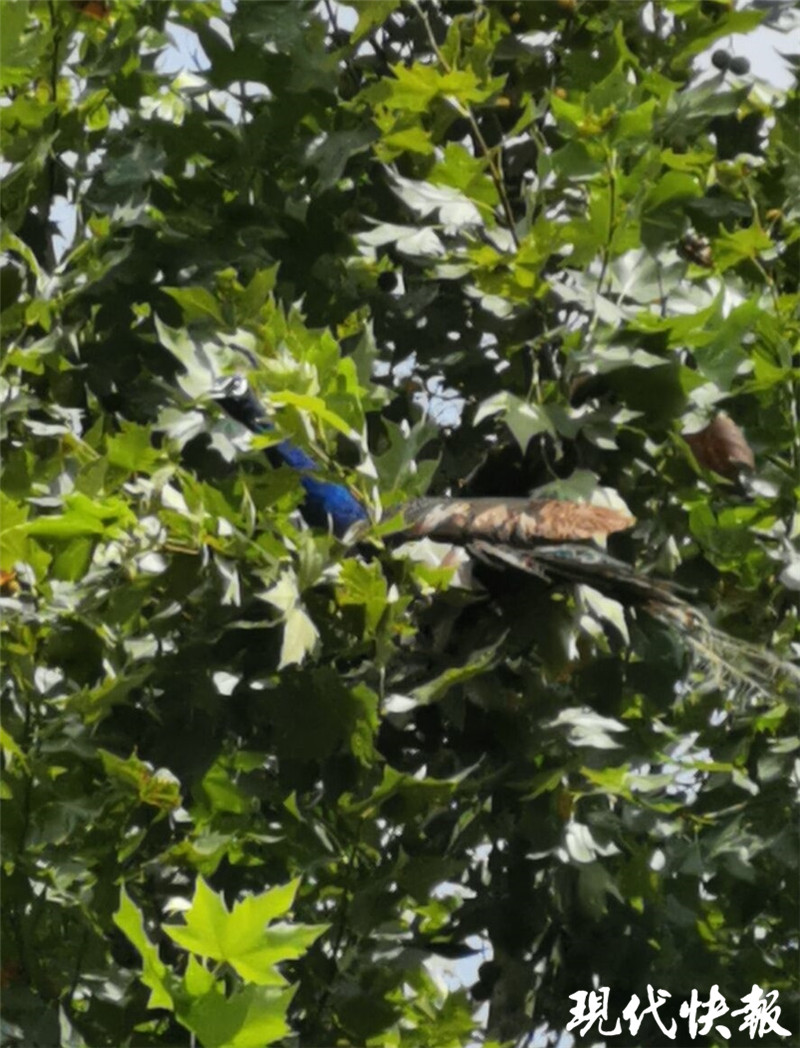9月1日,常熟市公安局興福派出所接群眾報警稱,黃河路郵政小公園一棵梧桐樹上立著一只孔雀。接到報警后,派出所一面聯(lián)系常熟市消防大隊黃河路中隊尋求幫助,一面安排民警攜帶抓捕裝備前往現(xiàn)場?,F(xiàn)場,許多群眾正在圍觀,民警在報警人的指引下見到了這只迷途的孔雀。只見它泰然自若立在離地約6米高的梧桐樹樹冠上,正悠閑地享受著傍晚的涼風(fēng)。