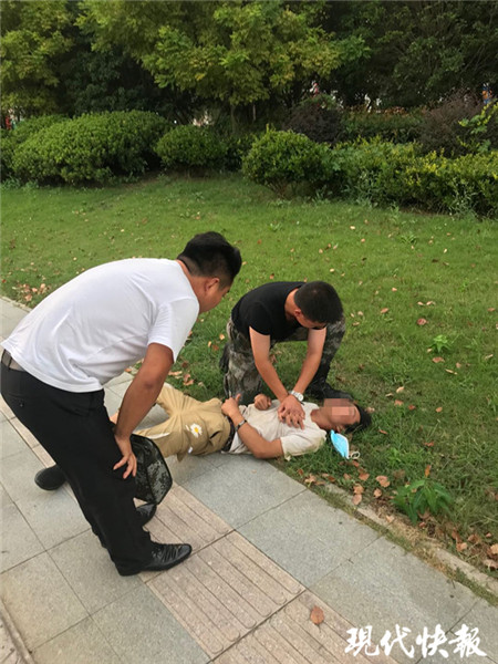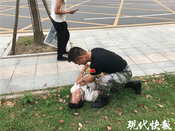 9月9日下午,海安市海安街道新橋社區(qū)民兵營營長于愛榮,駕車送剛從海安征兵辦審?fù)晷卤鴻n案的宋超前往火車站。宋超剛下車,就發(fā)現(xiàn)站臺門前的草坪上,一名小伙在地上打滾,渾身抽搐,旁邊的兩名市民急得不知所措。聽到求救聲,顧不得多想,宋超本能沖了過去,用急救技能立即對小伙展開救治,于愛榮則連忙撥打急救電話。