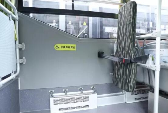 與常規(guī)公交車廂不同的是,該車取消了車后門正對面的兩座,設(shè)置了一個專供輪椅放置的區(qū)域,配有乘車安全帶、厚軟靠背等設(shè)施,可供輪椅乘坐者依靠,為有需要的乘客增添了一種出行選擇。