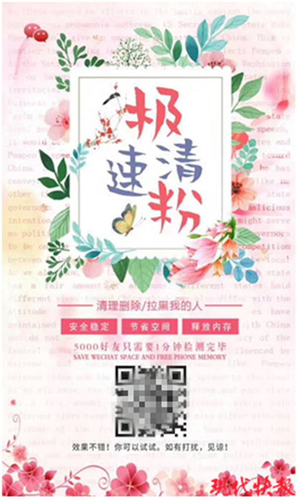 為圖省事和方便,部分微信用戶會選擇“清粉”服務。事后,有的用戶卻發(fā)現(xiàn)有陌生人通過自己分享的二維碼掃碼進群,或者自己被拉入了一些廣告群。今年6月,南通市公安局網安支隊民警在工作中發(fā)現(xiàn),部分微信朋友圈和群聊中散播的“清粉”軟件存在很大安全隱患。