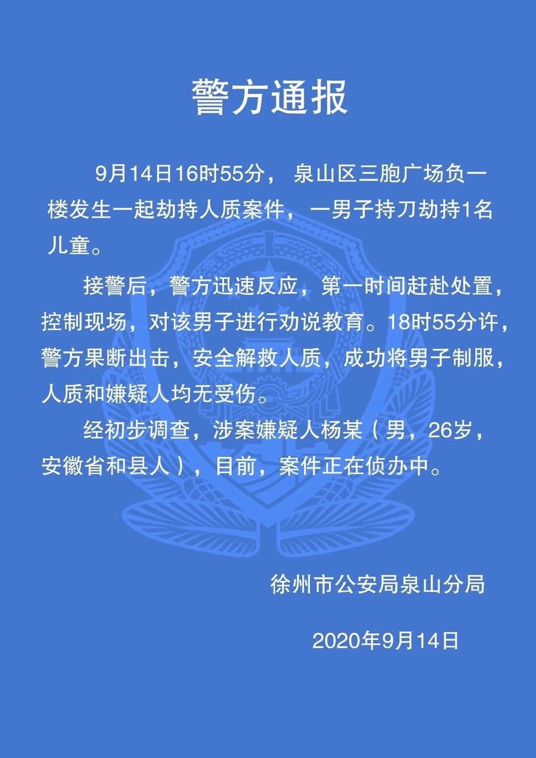 徐州三胞廣場(chǎng)內(nèi)一男子劫持1名兒童 已安全解救