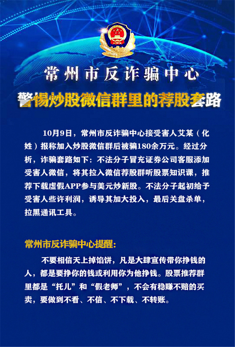 常州市反詐騙中心提醒市民,沒有人能保證穩(wěn)賺不賠,凡是大肆宣傳帶你掙錢的人,其實(shí)都是想要掙你的錢,群里的那些炒股群友們一般也都是“托兒”,因此遇到類似情況,要做到“不看、不信、不下載、不轉(zhuǎn)賬”,畢竟天上不會(huì)掉餡餅。
