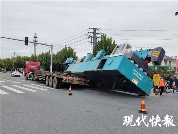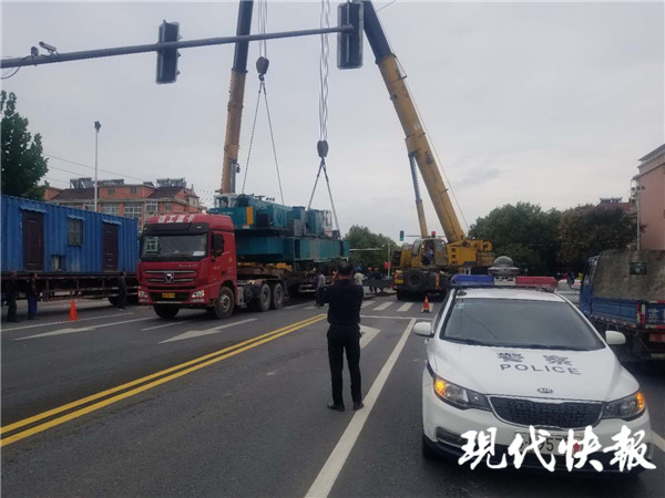 民警迅速趕到現(xiàn)場(chǎng),只見(jiàn)一輛半掛車上裝載的重型打樁機(jī)掉落在路口東北角,占據(jù)了右側(cè)兩股車道,民警急忙疏導(dǎo)過(guò)往車輛繞行,以免引發(fā)二次事故。