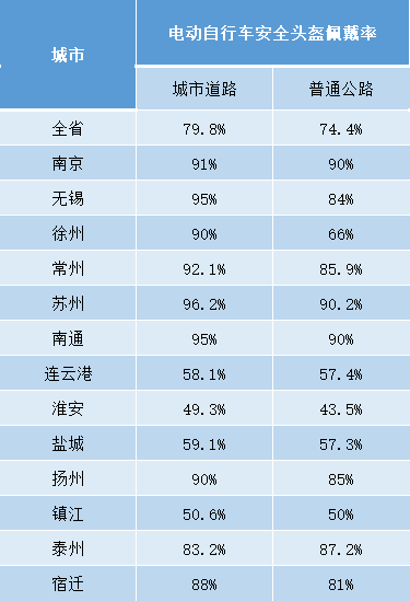 其中,城市道路和農(nóng)村道路電動(dòng)自行車駕乘人員頭盔佩戴率均超過90%的城市是:南京、蘇州、南通三市。