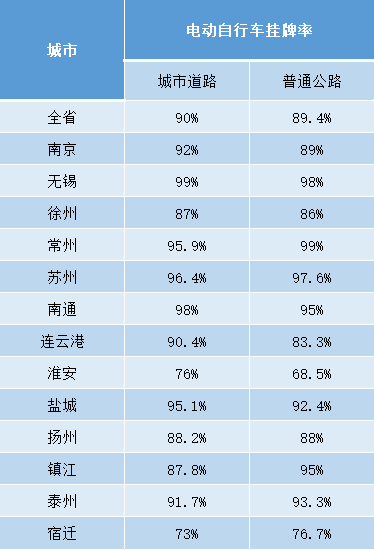全省城市路口電動(dòng)自行車掛牌率平均值為90%,其中無錫最高為99%;全省國省道普通公路電動(dòng)自行車掛牌率平均值為89.4%,其中常州最高為99%。