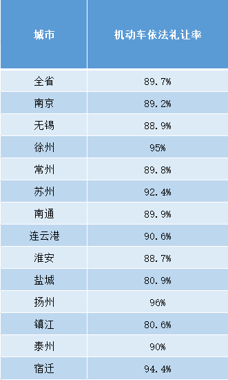 全省各地機(jī)動(dòng)車依法禮讓率平均值為89.7%,其中徐州、揚(yáng)州機(jī)動(dòng)車依法禮讓率均達(dá)95%以上。