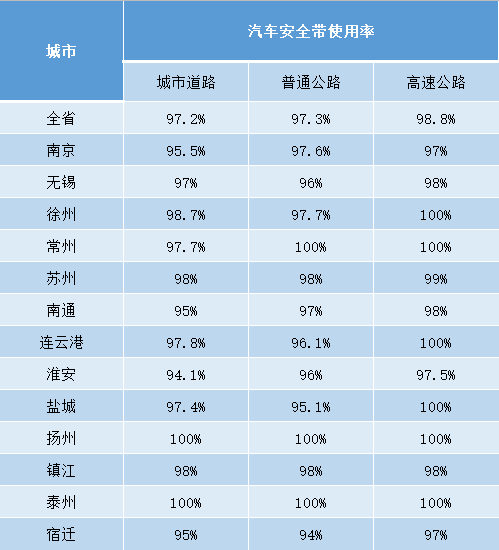 全省城市道路駕乘人員安全帶佩戴率平均值為97.2%,其中揚(yáng)州、泰州使用率達(dá)100%;普通公路駕乘人員安全帶佩戴率平均值為97.3%,其中常州、揚(yáng)州、泰州使用率達(dá)100%;高速公路駕乘人員安全帶佩戴率平均值為98.8%,其徐州、常州、連云港、鹽城、揚(yáng)州、泰州使用率達(dá)100%