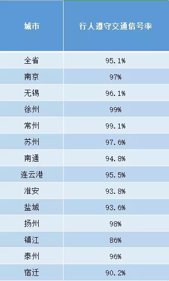 全省各地行人遵守交通信號(hào)率平均值為95.1%,南京、徐州、常州、蘇州、揚(yáng)州等地行人遵守交通信號(hào)率均超過97%。