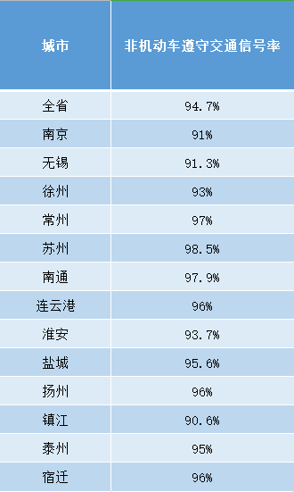 全省各地非機(jī)動(dòng)車遵守交通信號(hào)燈率平均值為94.7%,常州、蘇州、南通等地非機(jī)動(dòng)車遵守交通信號(hào)率均超過97%。