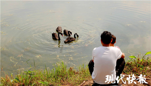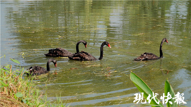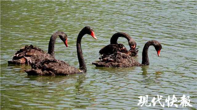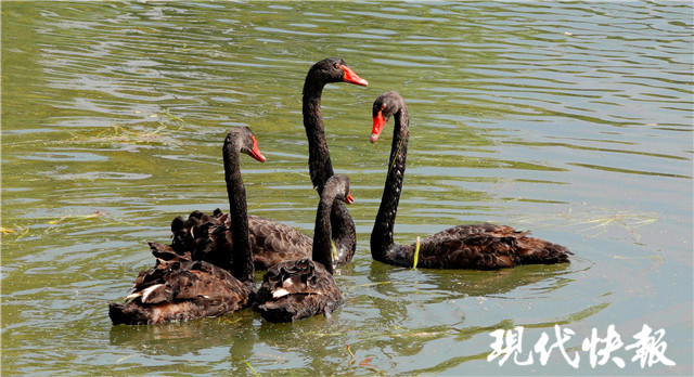 10月11日,現(xiàn)代快報(bào)記者來(lái)到燕雀湖邊,看到4只黑天鵝在這里“定居”。它們?cè)诓ü怍贼缘暮嫔嫌蝸?lái)游去,覓食嬉戲,不時(shí)發(fā)出一聲聲?shū)Q叫,仿佛在與游人“打招呼”,逗得孩子們合不攏嘴。