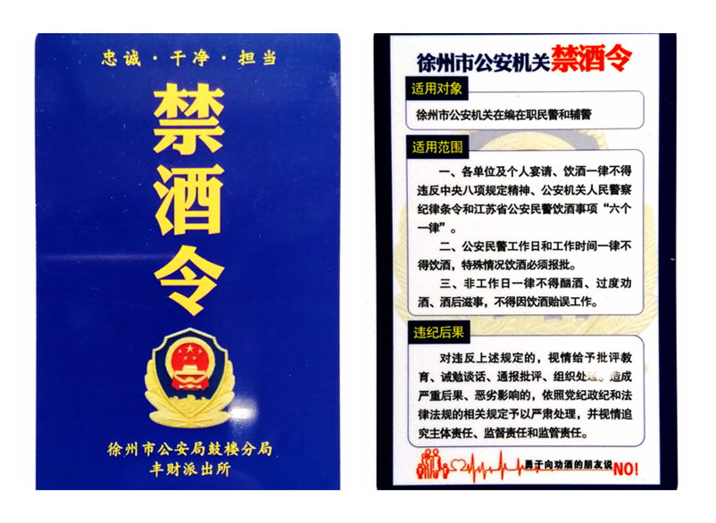 該禁令下發(fā)后,徐州各公安分局紛紛行動起來,鼓樓分局和全體民警、輔警簽訂了《禁酒承諾書》,并通過進行酒精測試、發(fā)放禁酒令宣傳卡片等舉措,對違規(guī)飲酒行為開展事前預(yù)防和事后監(jiān)督。