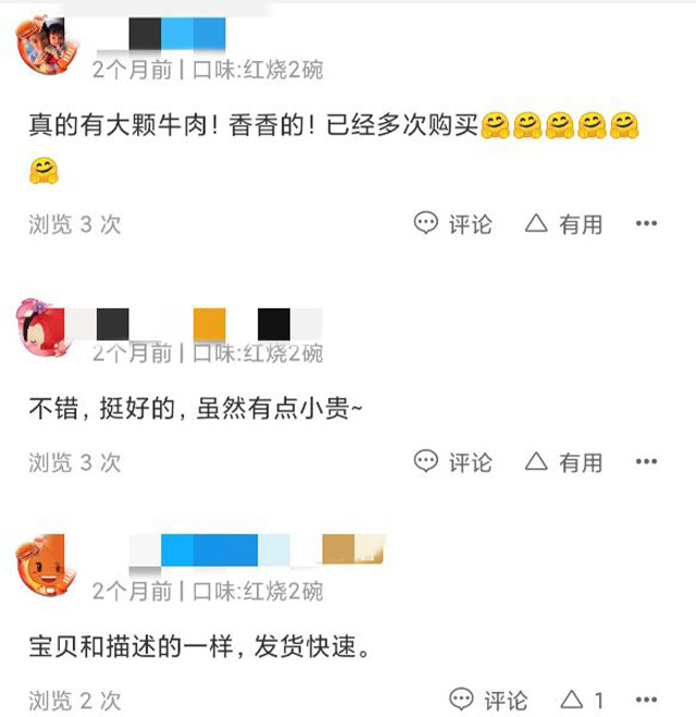 消費者是怎么評價的呢?“很好吃的方便面,真的有大塊肉在里面。”“好吃,連湯都喝完了,值這個價格。”不過也有人給差評,“太貴,沒吃出‘富貴’的氣質(zhì)。”“真的很一般,感覺還不如普通方便面。”根據(jù)評價分類,認為性價比高的有236條評價,性價比一般的有269條。