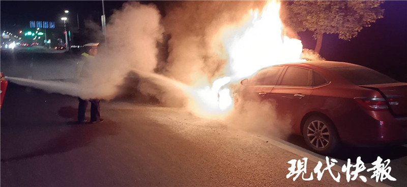 11月9日,南京市公安局江寧分局交警大隊(duì)湖熟中隊(duì)接到群眾報(bào)警,在湯銅路湖熟段有一輛轎車起火了。接到警情后,中隊(duì)立即組織警力前往現(xiàn)場進(jìn)行處置。到達(dá)現(xiàn)場時(shí),轎車的發(fā)動機(jī)位置已被火焰覆蓋,出警人員立即取出滅火器進(jìn)行滅火,但由于火勢較大,滅火器已無法撲滅,只能等待消防到達(dá)現(xiàn)場。